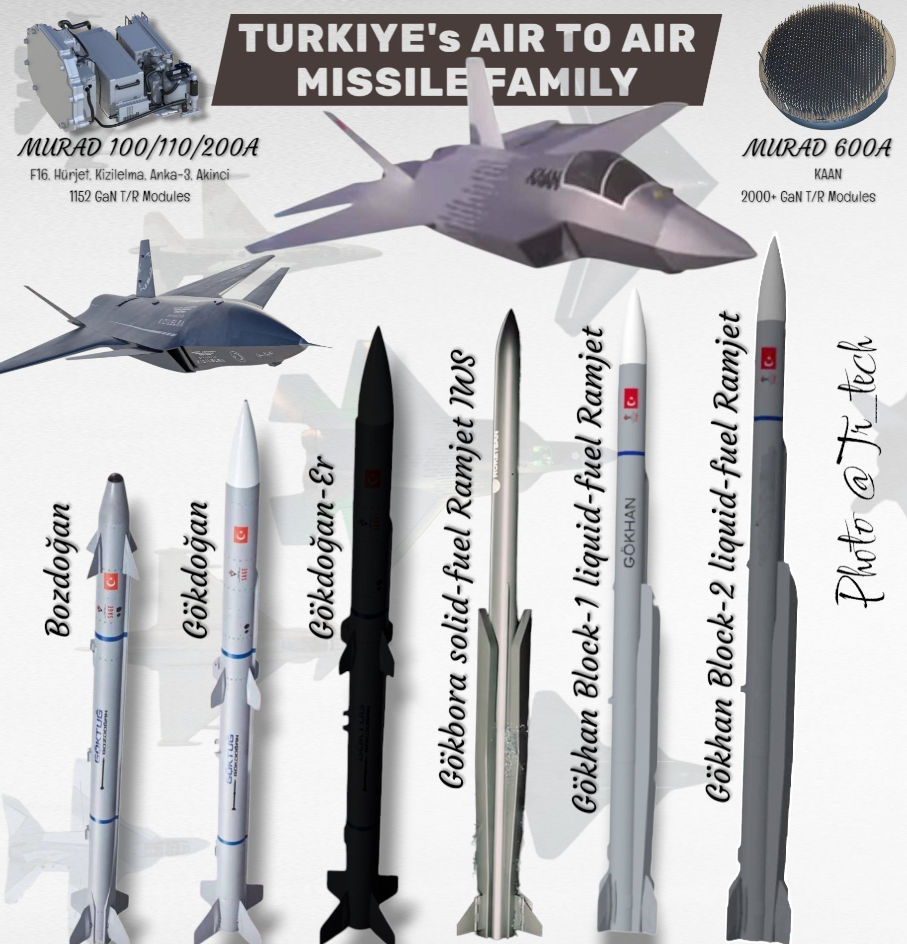 The Bozdoğan (WVRAAM) and Gökdoğan (BVRAAM) missiles each feature solid-fuel rocket motors, advanced seekers, and high agility for dogfight and long-range engagements respectively.