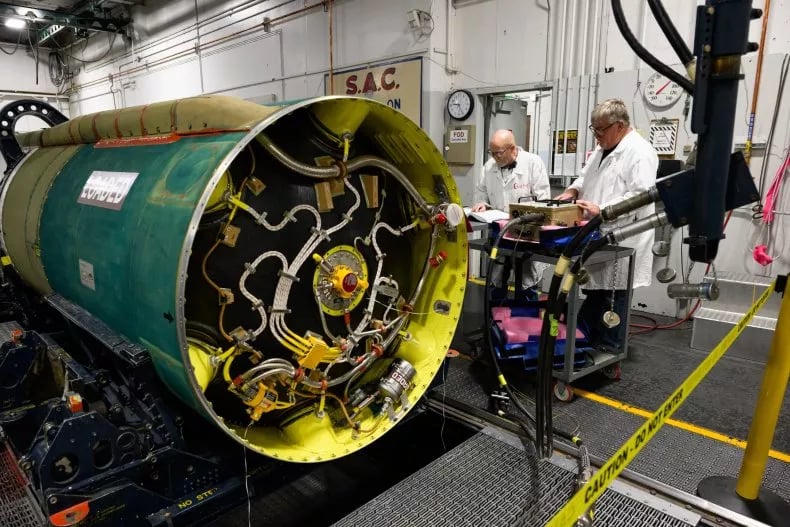 Newly released photos show U.S. Air Force personnel conducting depot-level maintenance on Minuteman III nuclear-capable intercontinental ballistic missiles, as the U.S. modernizes its aging land-based nuclear arsenal.
