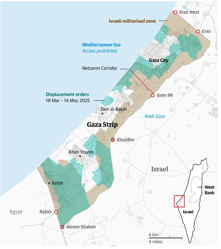 The Israeli military has annexed 36% of Gaza’s land into an expanded buffer zone, effectively erasing key food-producing areas, particularly in Beit Lahia, Rafah, and Khan Younis. UN assessments show 75% of agricultural fields and olive orchards have been damaged or destroyed, along with 1,531 irrigation wells.