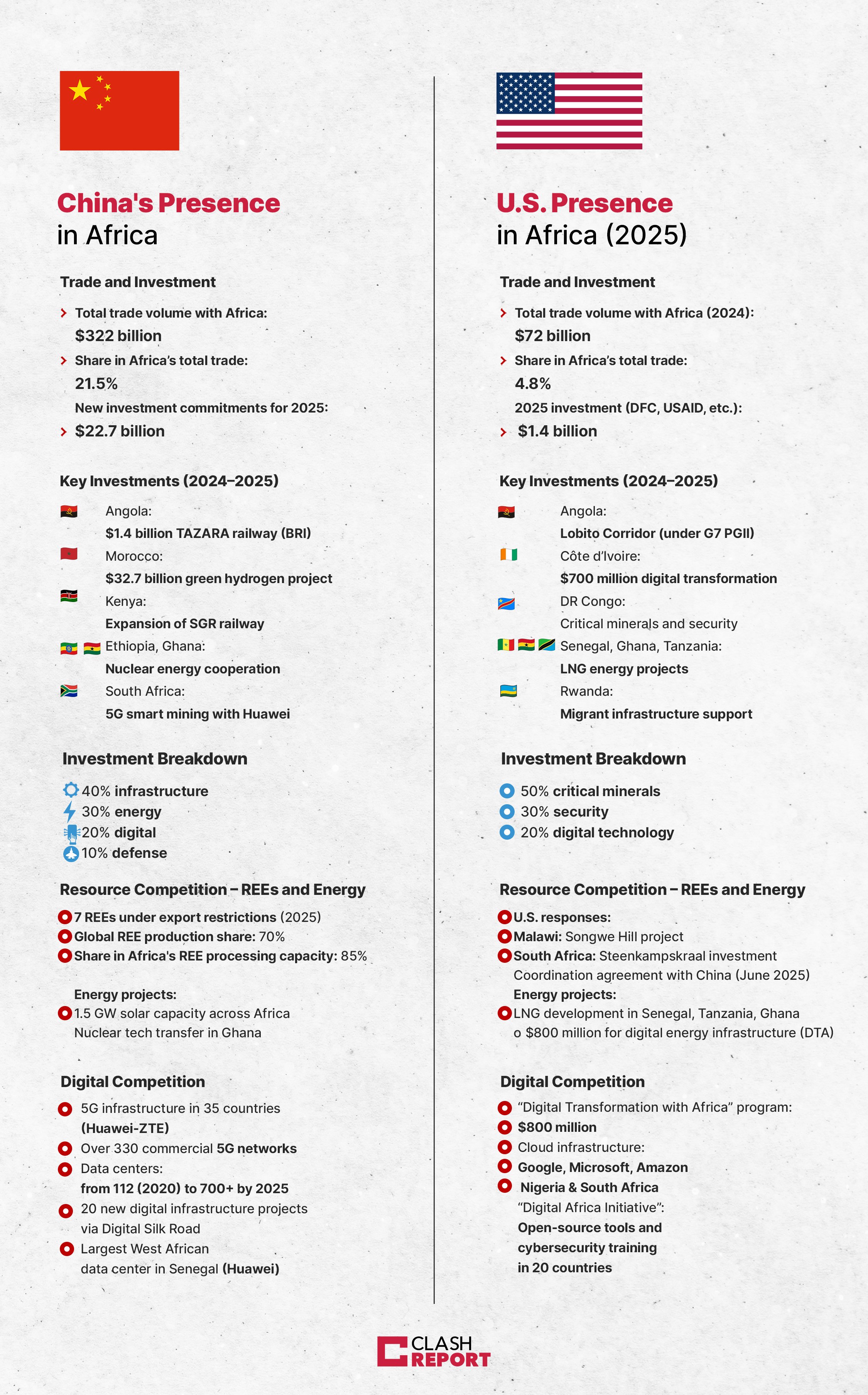 China–Africa trade hits $322B, with $22.7B in new investments for 2025. China–Africa trade hits $322B, with $22.7B in new investments for 2025. China focuses on infrastructure (40%) and energy (30%); U.S. prioritizes minerals (50%) and security (30%).