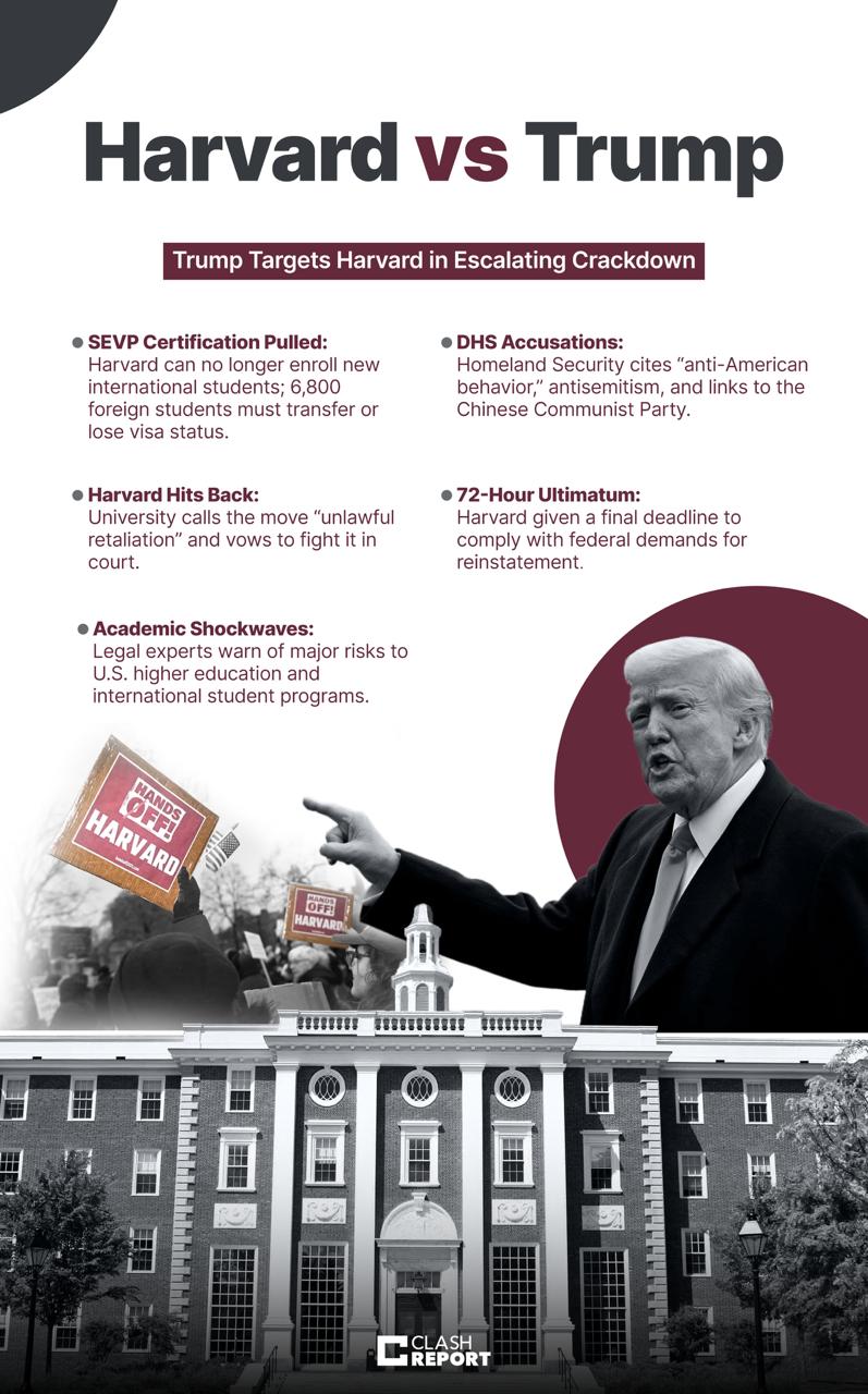 Trump admin pulls Harvard’s SEVP certification—6,800 international students must leave or transfer. Harvard vows legal battle, calls it “unlawful retaliation”. 72-hour deadline to comply.