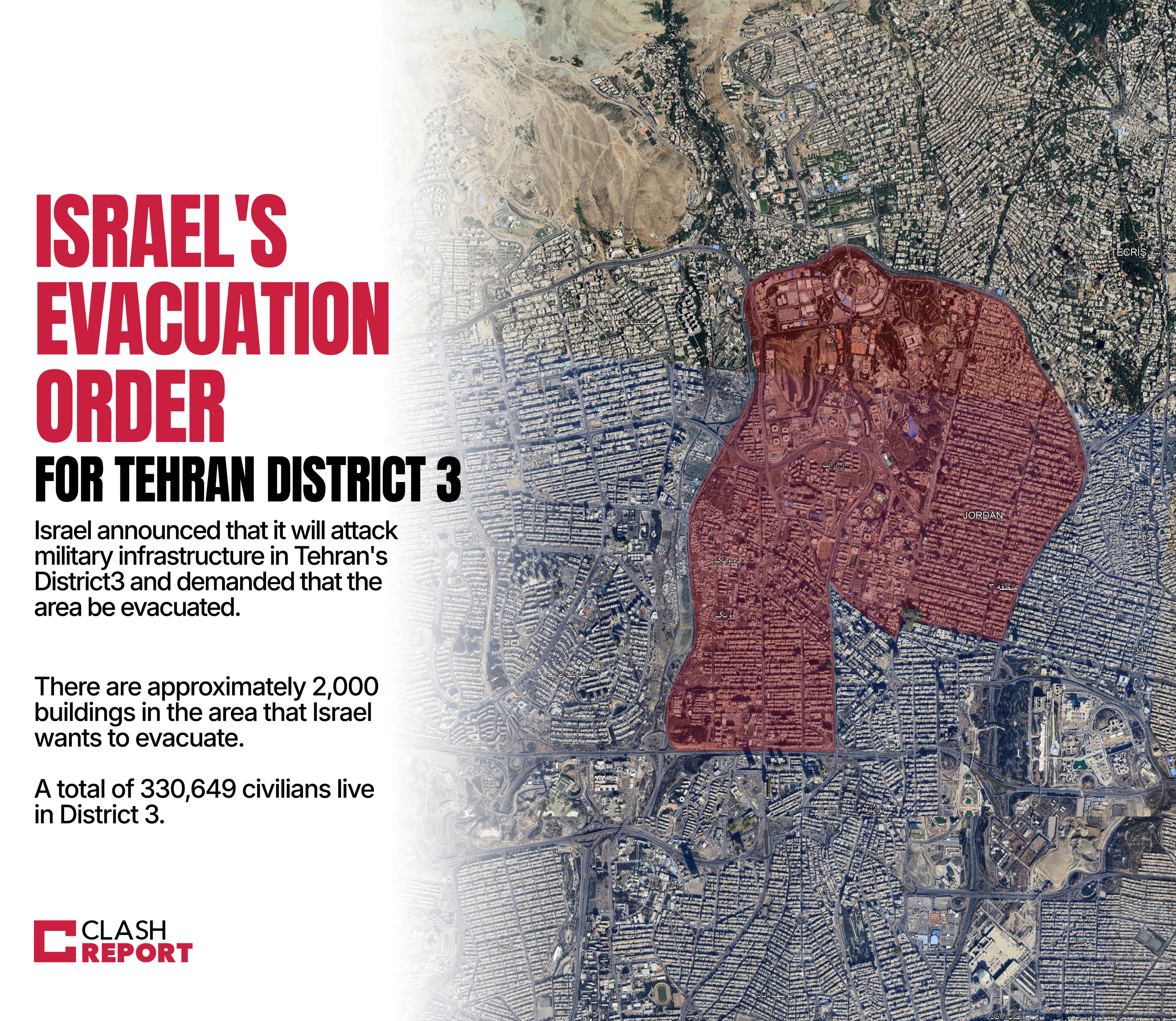 Israel orders evacuation of Tehran’s District 3 ahead of planned strikes on military infrastructure. Around 2,000 buildings affected. Over 330,000 civilians live in the area.