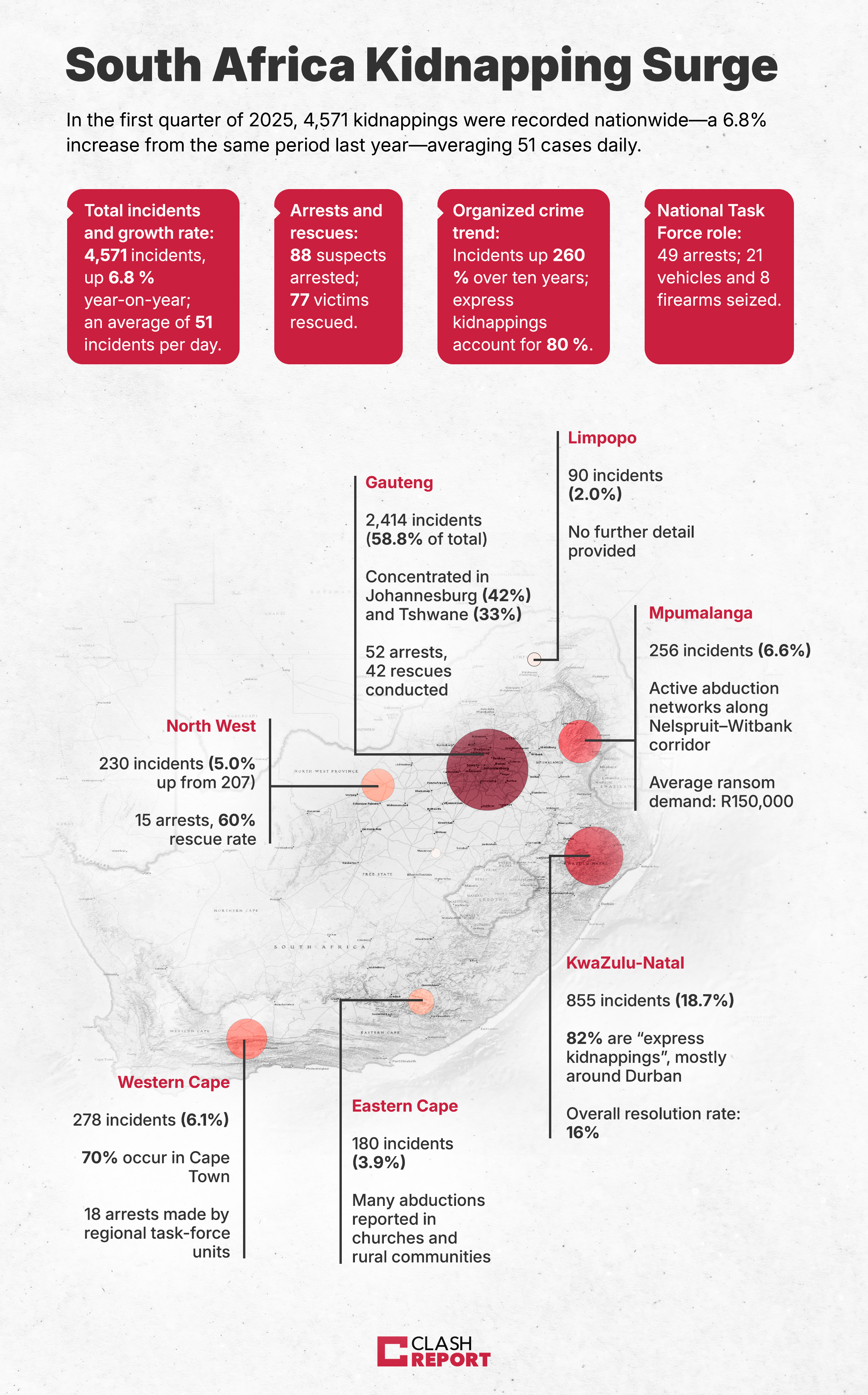 4,571 kidnappings in Q1 2025 mark a 6.8% year-on-year surge. Gauteng, Durban & Nelspruit-Witbank are key hotspots—over 75% of cases. 88 arrests, 77 rescues; 82% of KwaZulu-Natal abductions are express kidnappings.