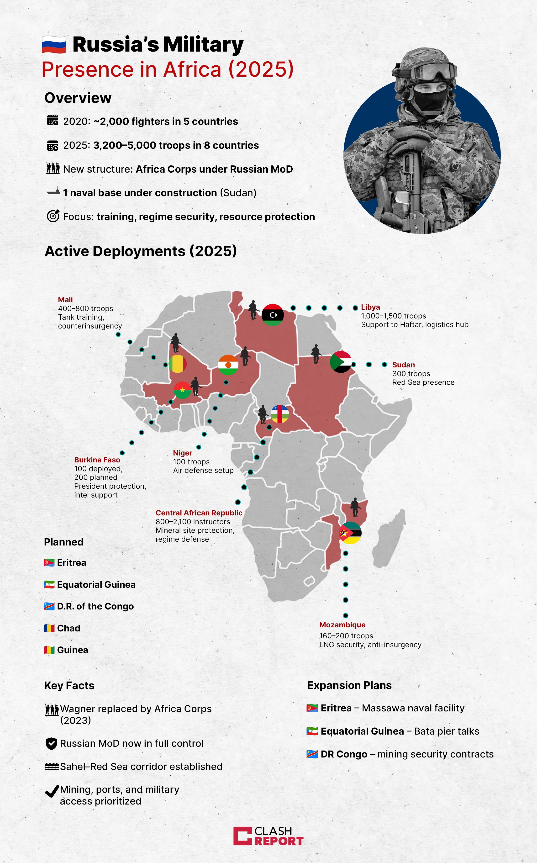 Troop presence rises to 3,200–5,000 across 8 countries, up from 2,000 in 2020. Focus on regime protection, counterinsurgency, and resource site security. Expansion eyed in Equatorial Guinea and DR Congo for strategic access.