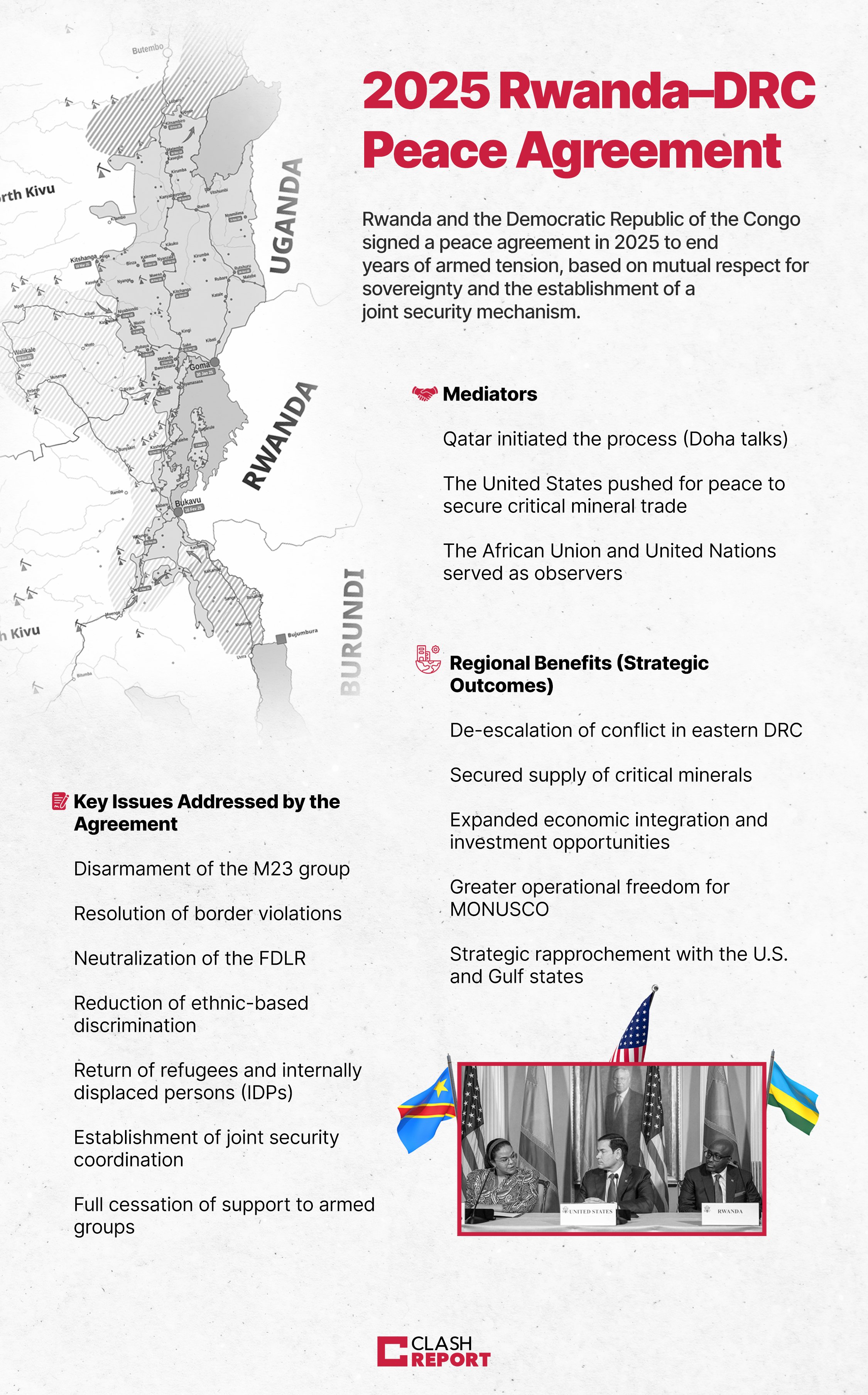 Key points: - M23 disarmed - Border disputes resolved - Joint security coordination - Refugees to return Mediated by Qatar, supported by U.S. for mineral trade, observed by AU & UN.