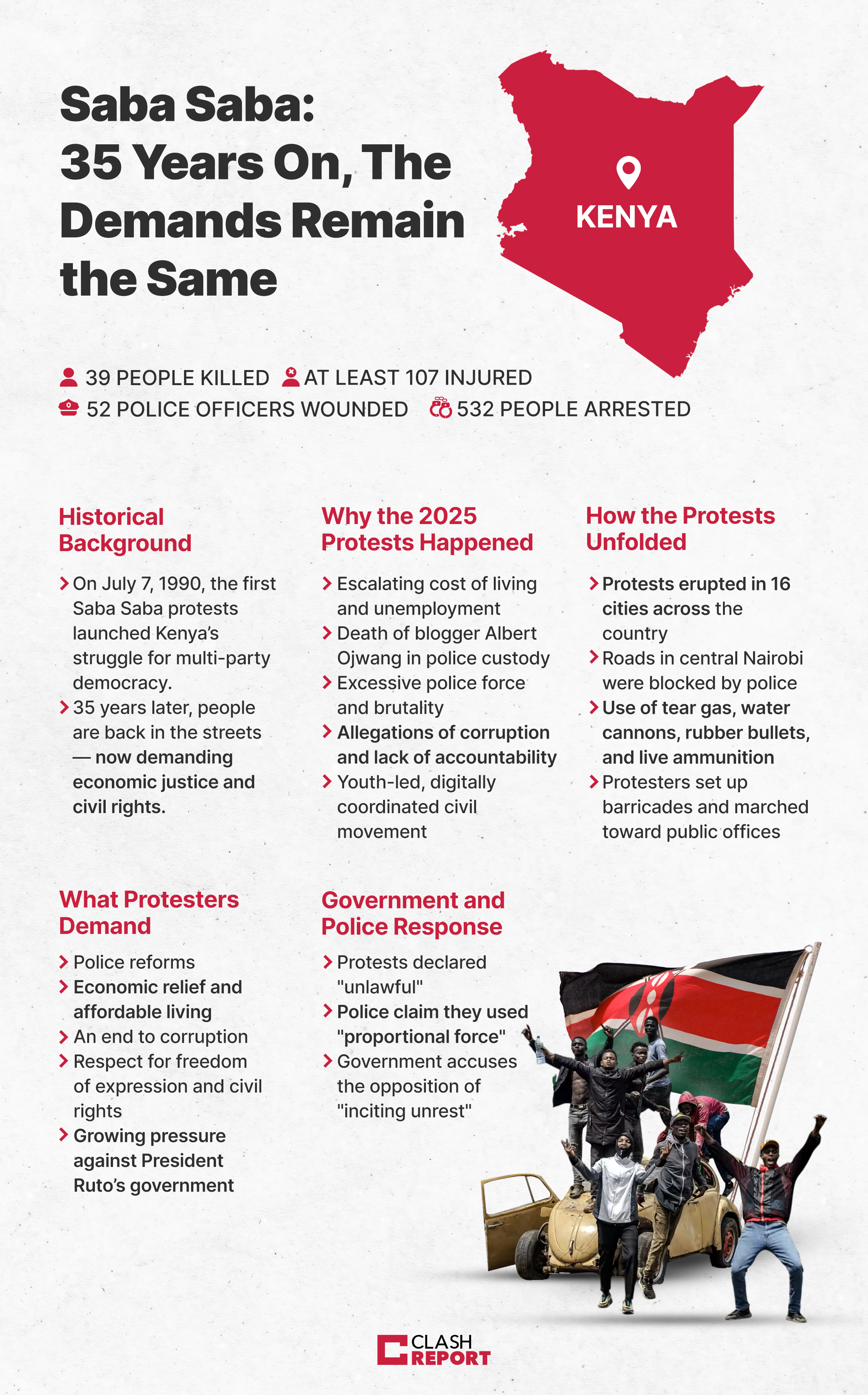 39 killed, 100+ injured, and 532 arrested during Kenya-wide protests. Demonstrations erupted in 16 cities, demanding economic justice and civil rights. Triggered by rising costs, corruption, and the death of a blogger in custody.