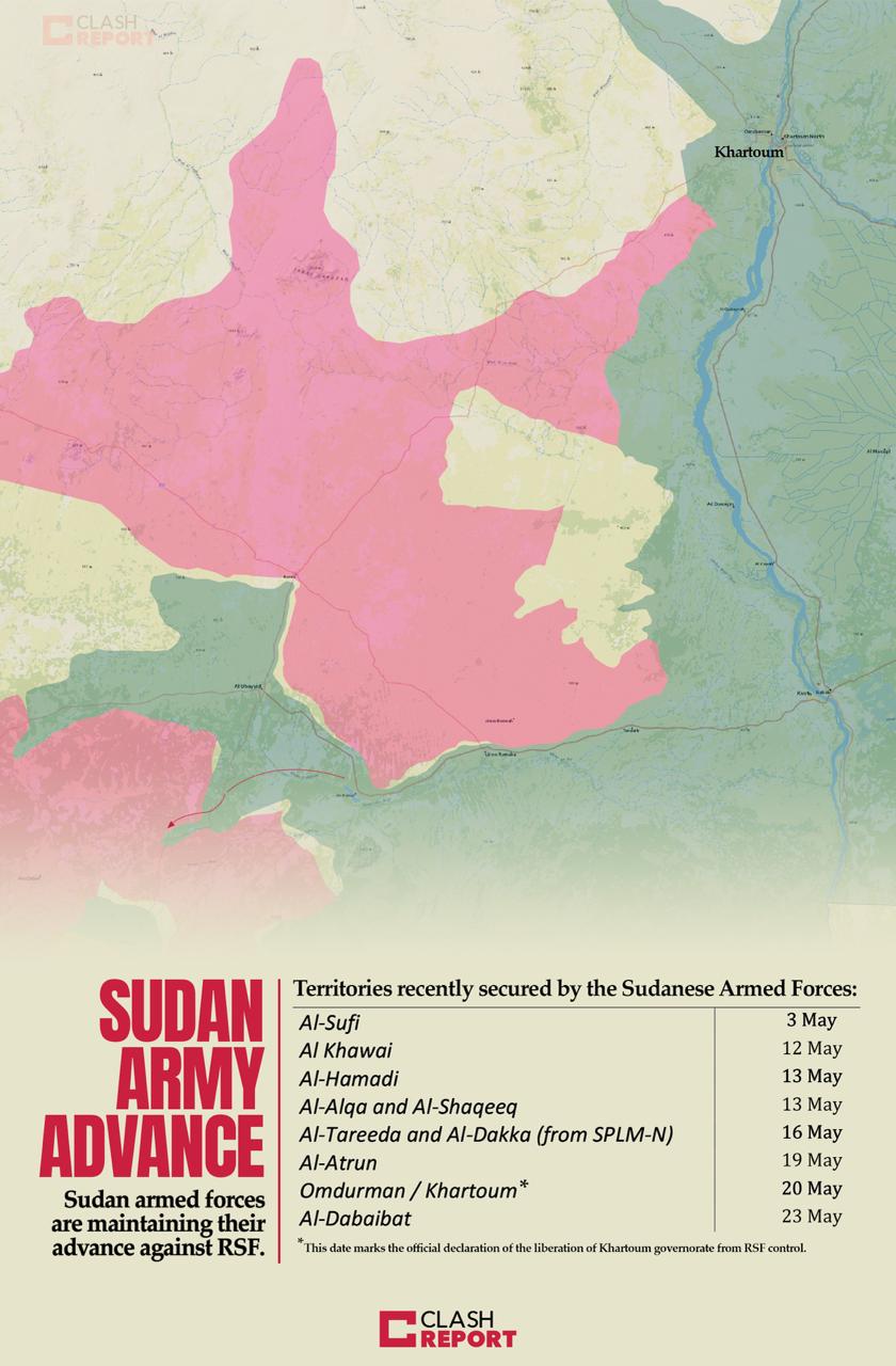 From Al-Sufi to Khartoum, Sudanese Armed Forces are regaining key territories from RSF. Latest gains include Omdurman and Al-Dababat. Since early May, at least 10 locations have been recaptured as part of a major military push.