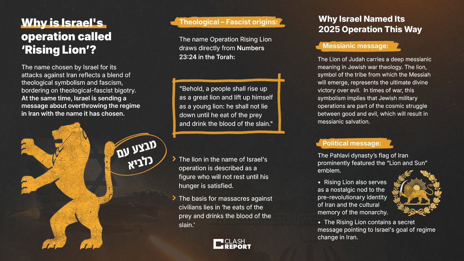 The name isn’t random—it blends theology, messianic war symbolism, and political messaging: Biblical Roots: Comes from Numbers 23:24 – “a people shall rise as a lion… eat the prey and drink the blood of the slain.” Messianic Signal: Refers to the Lion of Judah and divine military victory. Political Echo: The Pahlavi-era “Lion and Sun” flag—a subtle nod to regime change in Iran.
