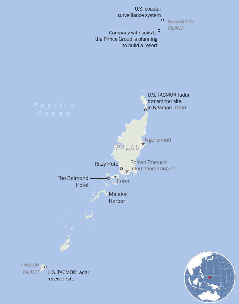 A hotel project near Malakal Harbor, the Belmond, owned by Chinese national Zhang Zhengrong, is viewed with suspicion by U.S. and Palauan security officials. Though Zhang denies involvement in espionage, records link him to Chinese scam networks and illegal campaign donations.