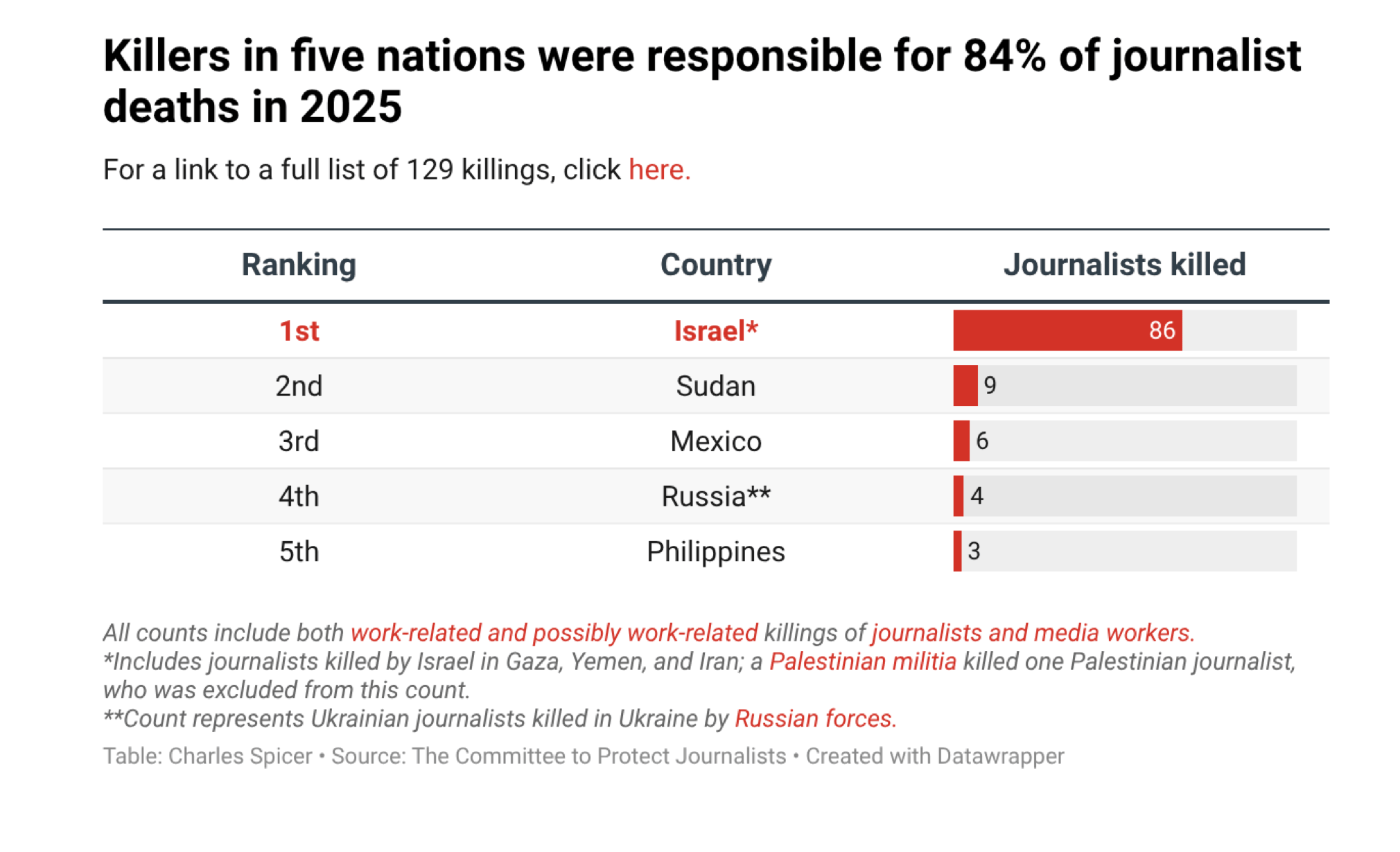 Committee to Protect Journalists said 129 journalists were killed worldwide in 2025, a record high, with 86 deaths attributed to Israeli attacks on Palestinians, hailing IDF responsible for killing more journalists than any other military since CPJ began documentation in 1992.