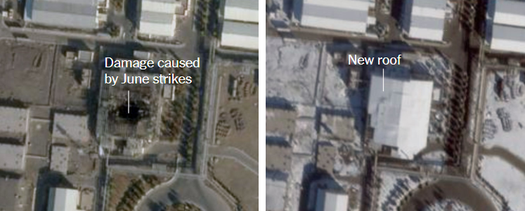 At Natanz, Iran’s main uranium enrichment complex south of Tehran, damaged structures have been covered with roofing, obscuring views of the interior. At Isfahan, destroyed buildings linked to uranium conversion have also been roofed over.