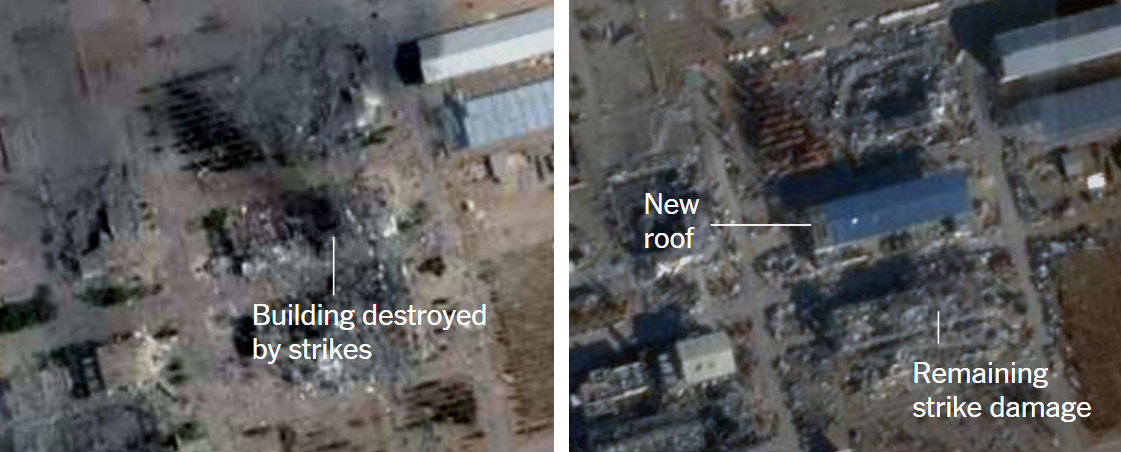 Although new roofing structures have appeared at some sites since December, analysts caution that satellite imagery cannot confirm activity underground. Much of the aboveground damage from the June strikes remains visible.