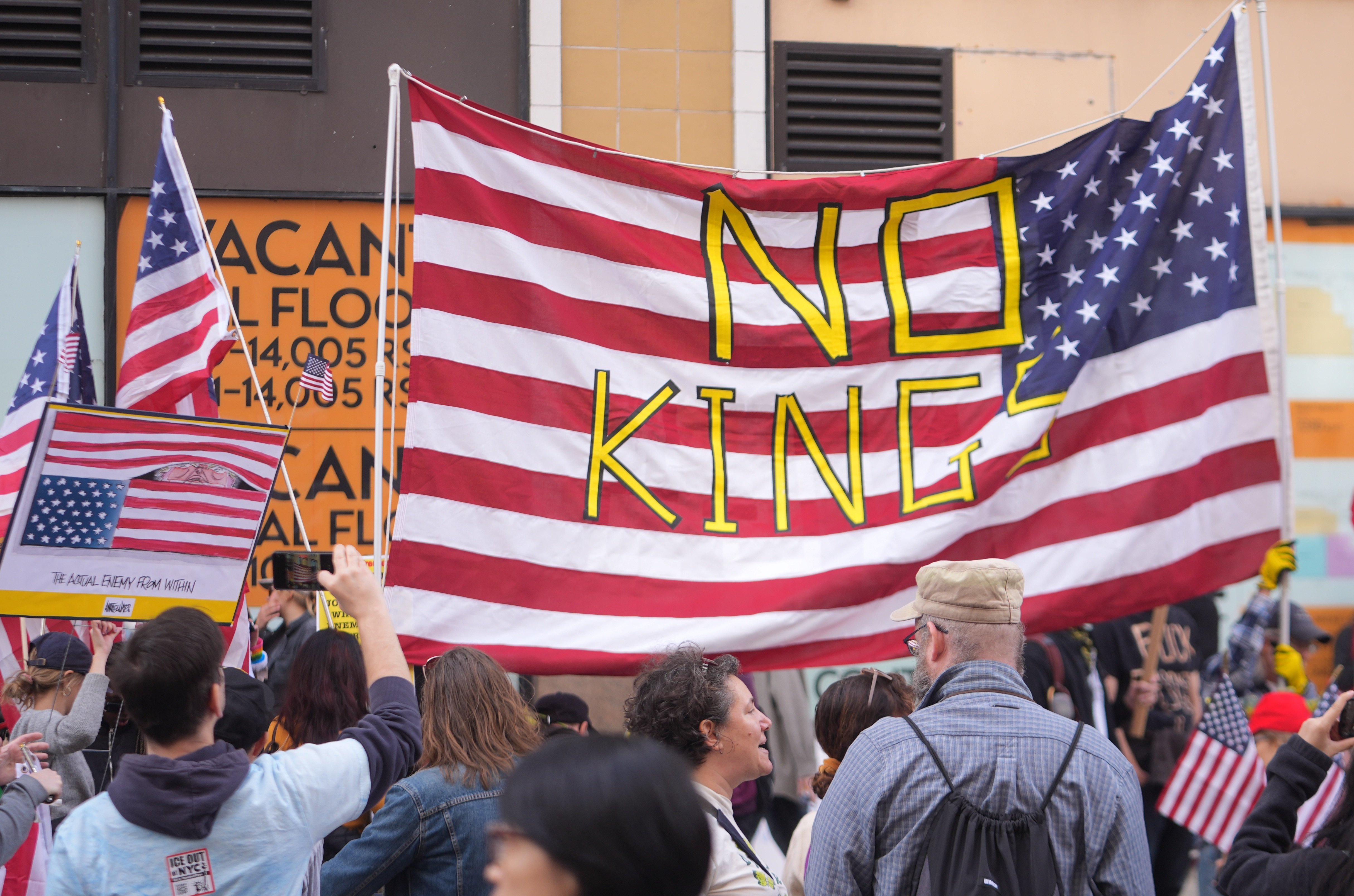 Thousands filled New York’s iconic Times Square, holding banners that read “No Monarchy, Only Democracy” and “The Constitution Is Not Optional.”