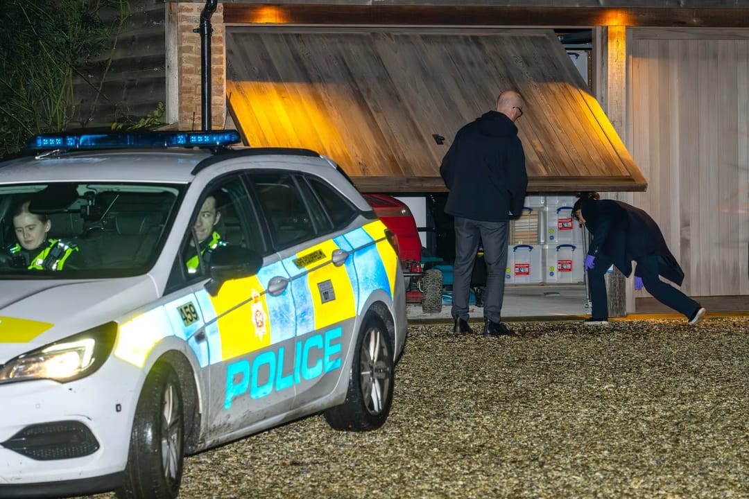Witnesses reported multiple marked and unmarked police vehicles outside the Wiltshire address. Officers wearing body cameras were seen entering the London property, carrying boxes and bags inside as photographs appeared to be taken.