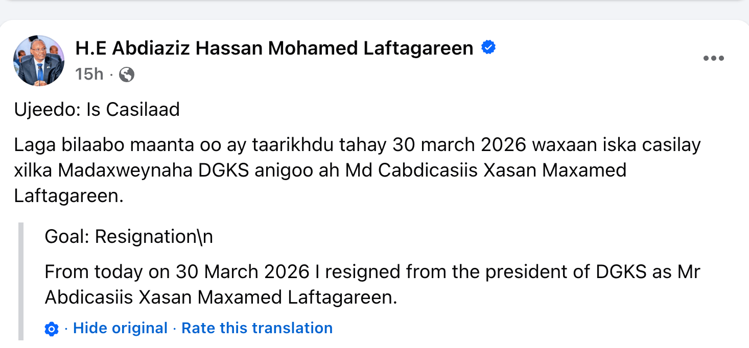 The military move coincided with the resignation of South West state president Abdiaziz Hassan Mohamed Laftagareen, who stepped down days after being re-elected for a five-year term.