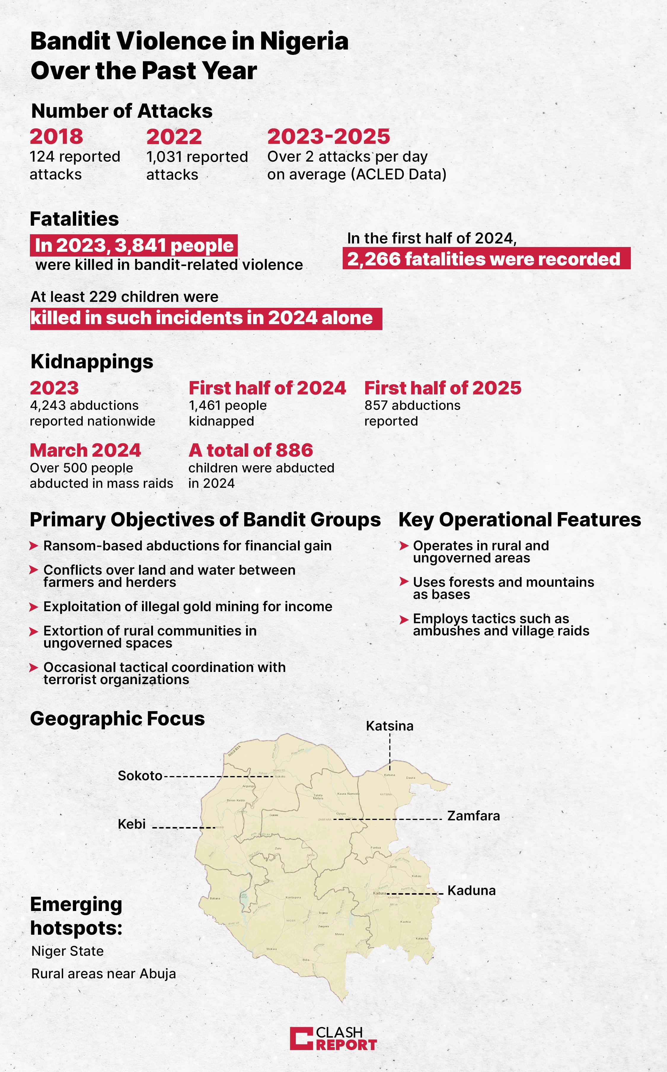 Bandits operate from forests and mountainous terrain, conducting ransom raids, illegal mining, and extortion.