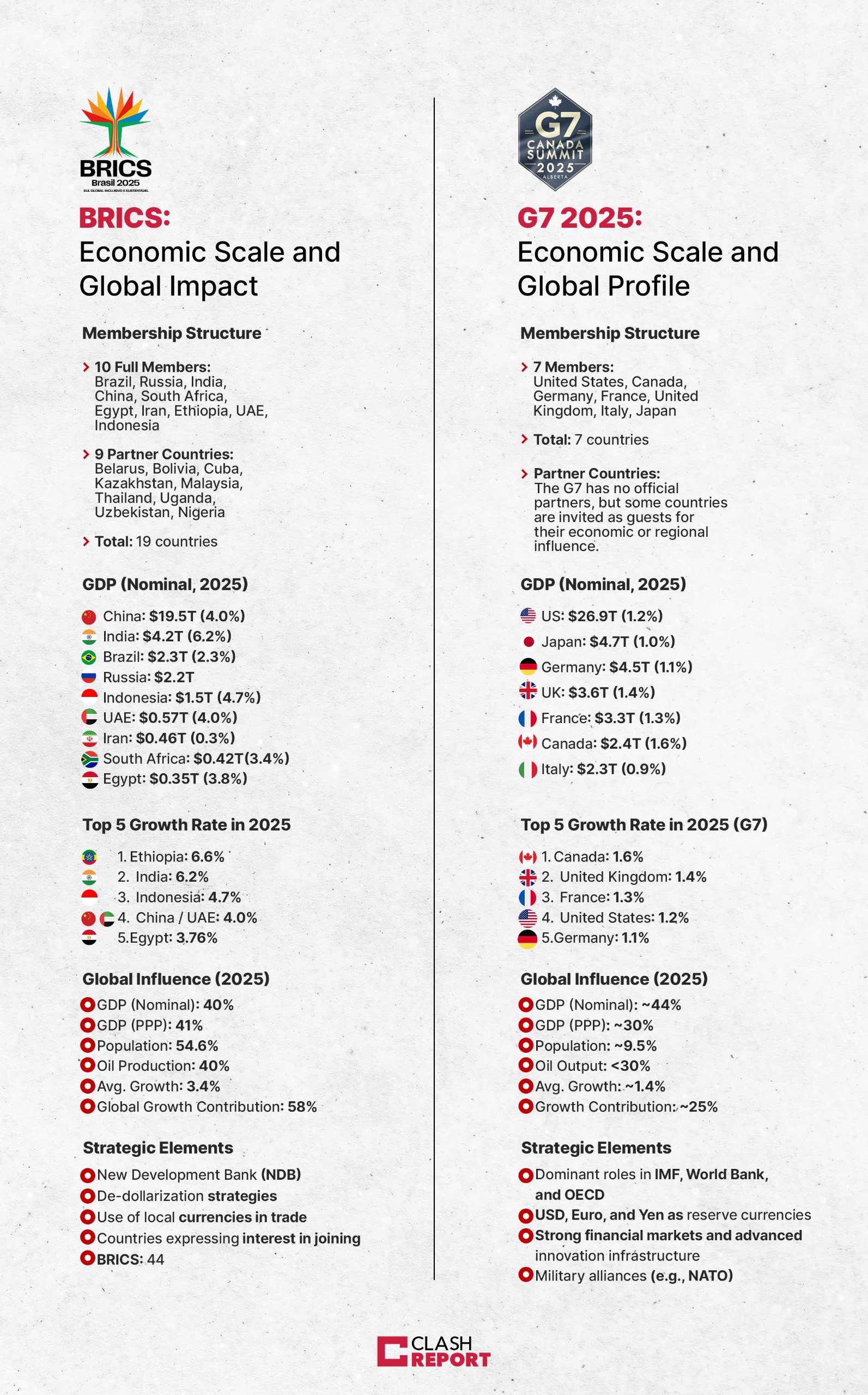 Economic comparisons highlight the rivalry. BRICS countries collectively account for about 40 percent of global nominal GDP and 41 percent of purchasing power parity (PPP) output, while the G7 retains roughly 44 percent of nominal global GDP.