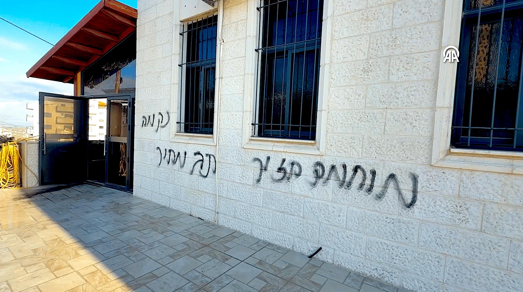 Graffiti bearing racist slogans was visible on the exterior, including the words “revenge” and “price tag.”