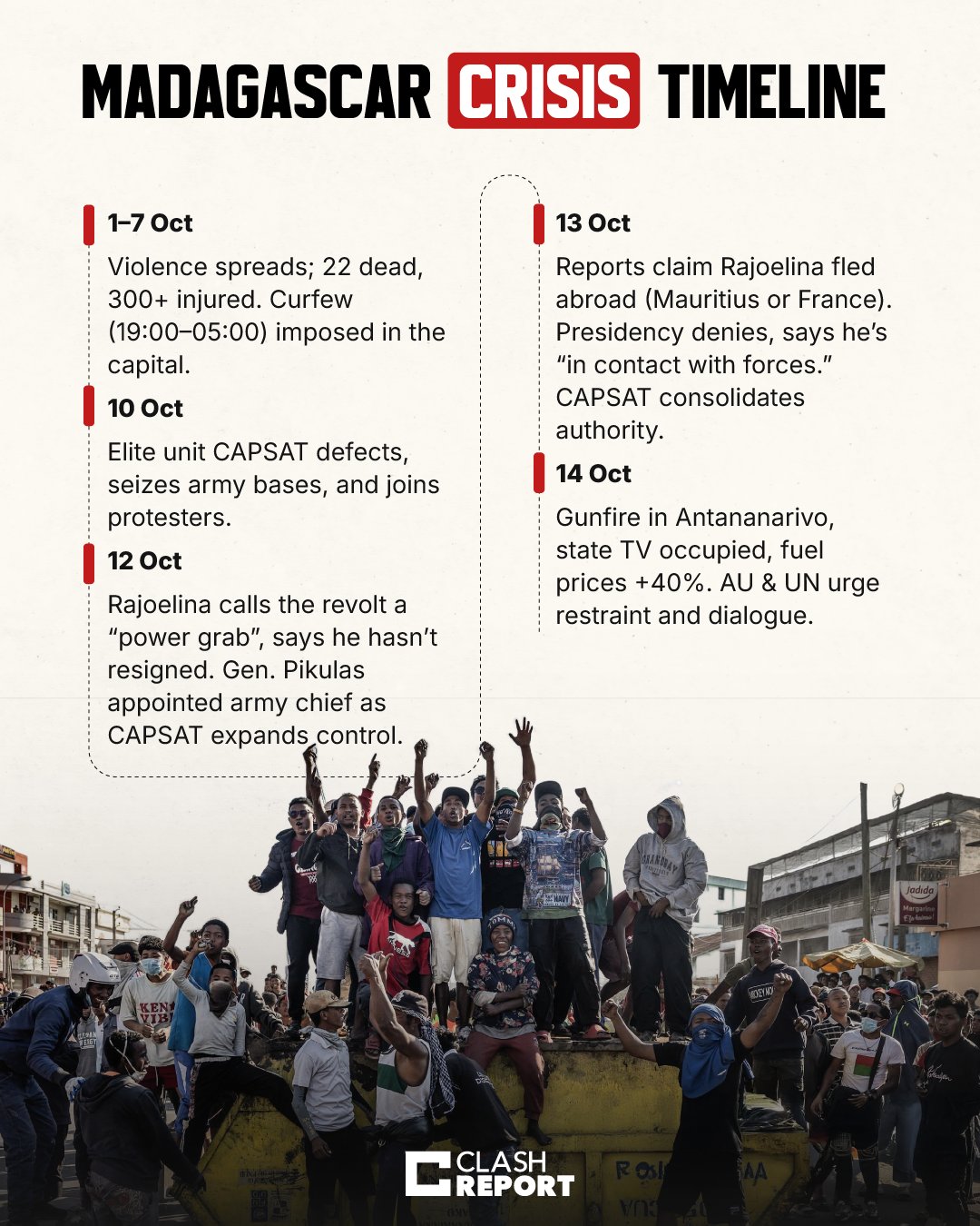 The following day, October 12, Rajoelina fled the country amid fears for his safety. Reports indicated he left for Dubai aboard a French military aircraft.