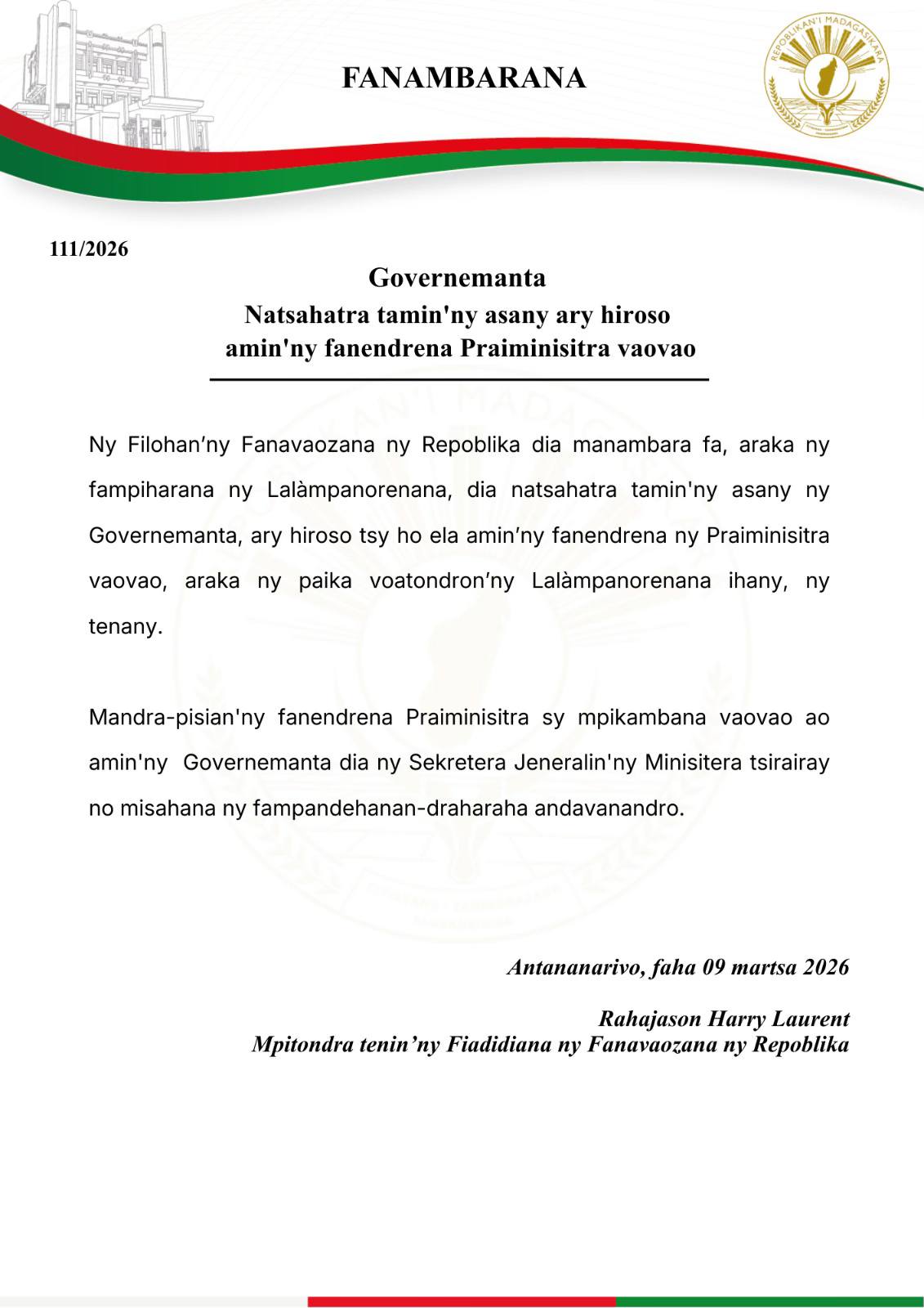 The dismissal was announced on March 9, 2026, in a statement from presidential spokesperson Harry Laurent Rahajason, who said the president would soon appoint a new prime minister in accordance with constitutional procedures. The government statement did not provide a reason for the decision.