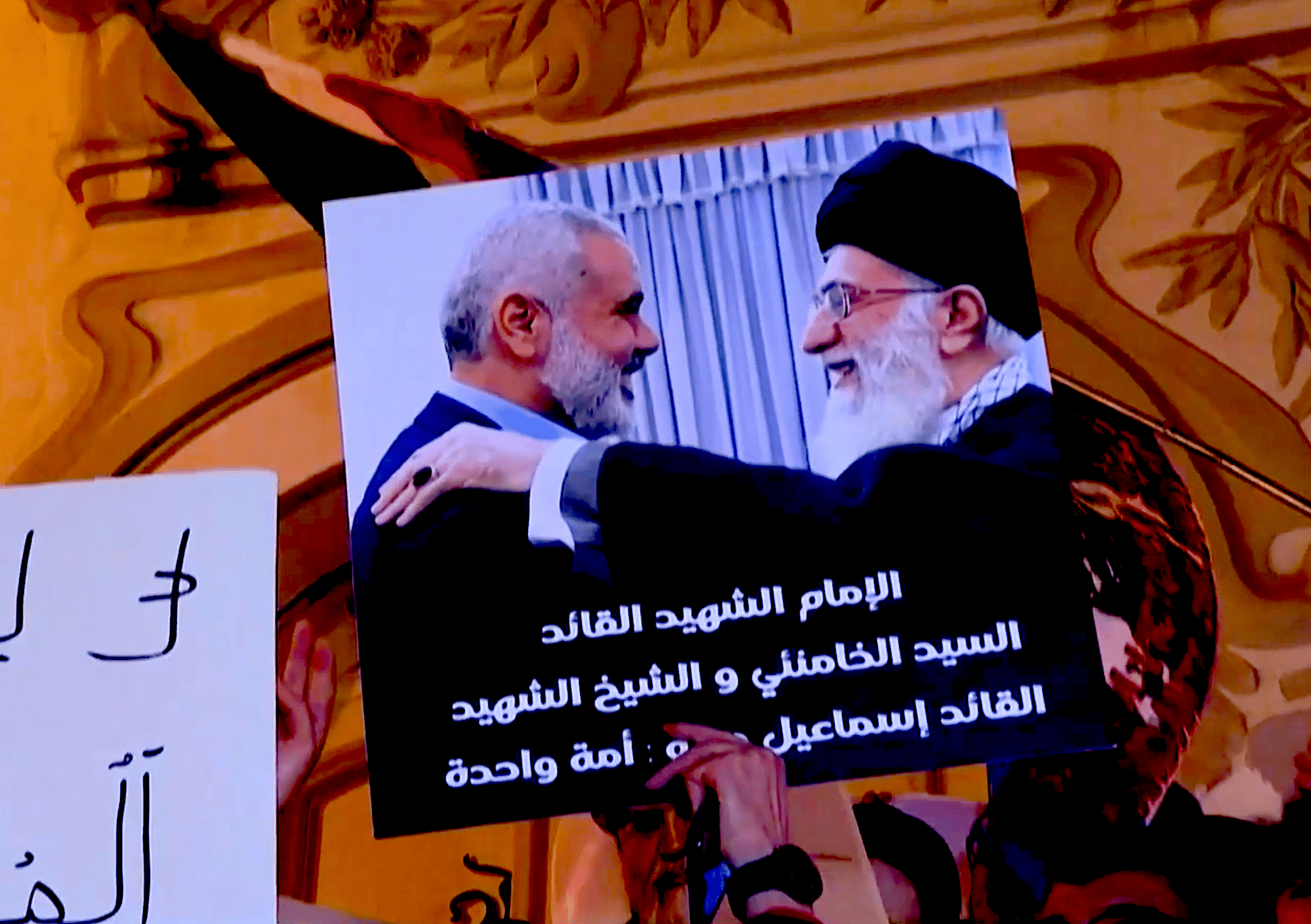 Some demonstrators also carried images of regional figures including Hezbollah’s former leader Hassan Nasrallah and Hamas political leader Ismail Haniyeh.