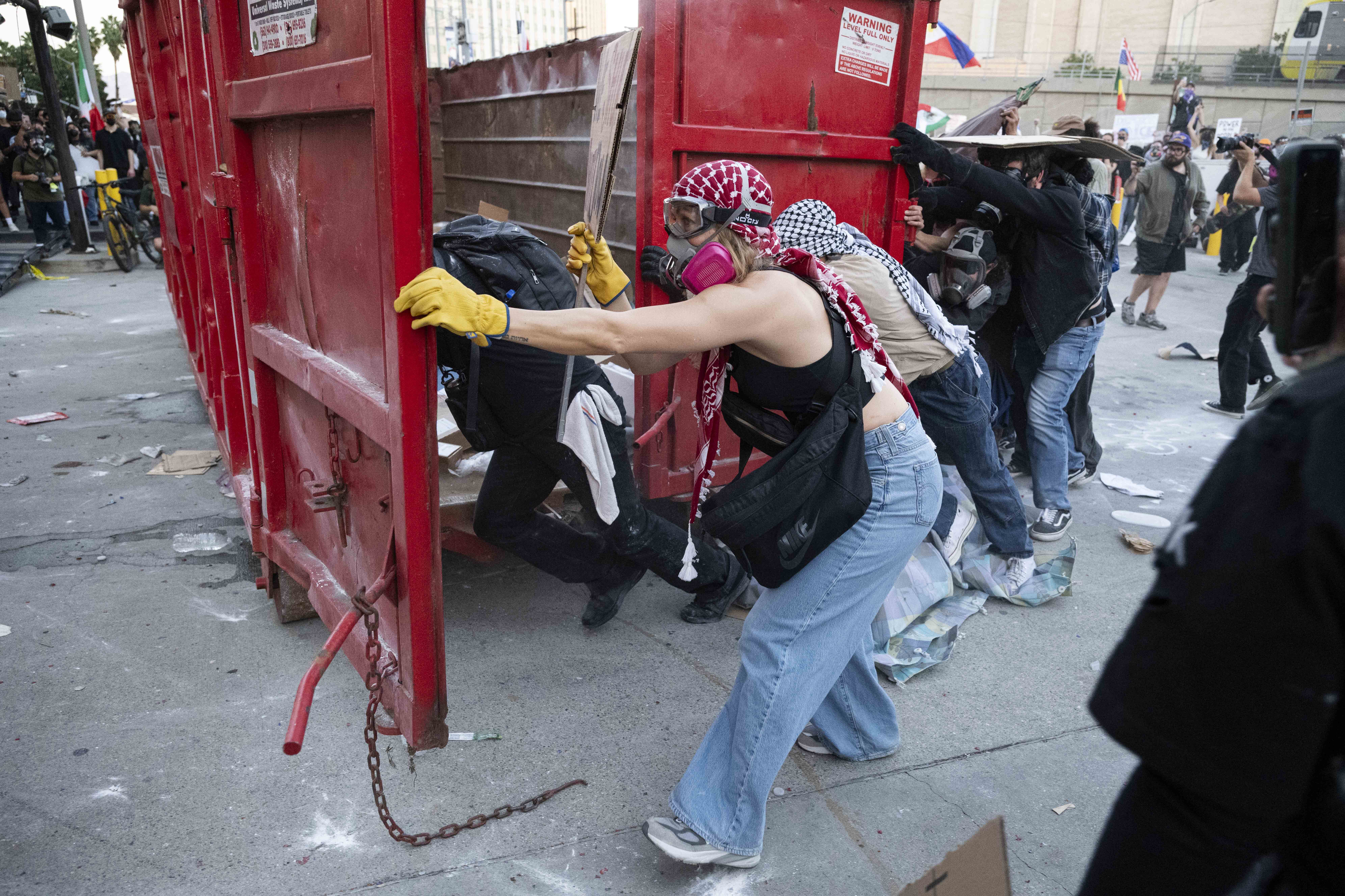 Demonstrators in Los Angeles, California push a dumpster towards the entrance of the Federal Detention Center as part of expressing solidarity with Minnesota to highlight what organizers describe as a humanitarian and civil rights crisis.