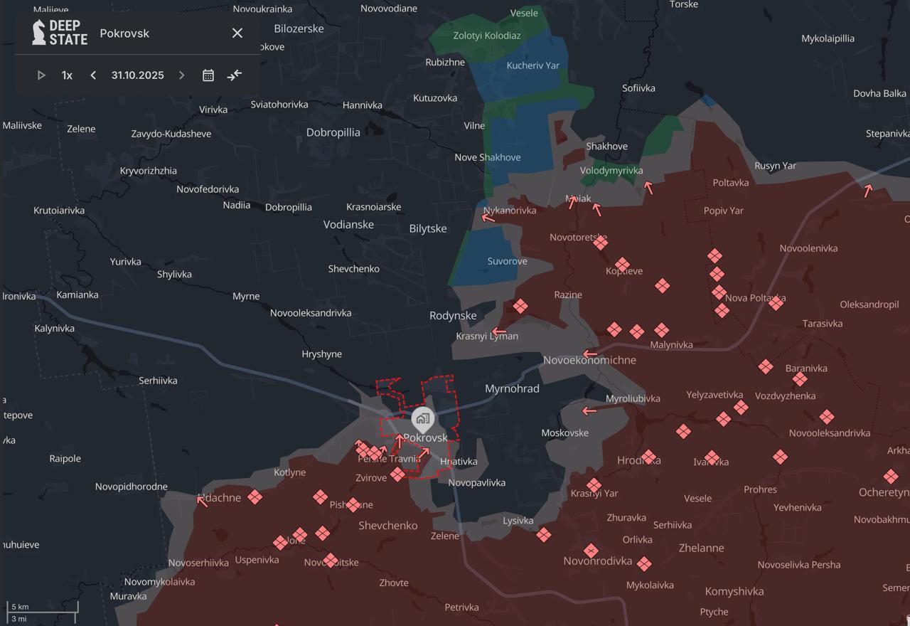 As of late October 2025, Ukrainian command confirmed Russian footholds near Myrnohrad and in several urban sectors.